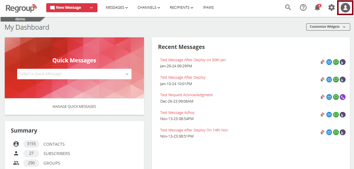 You can change the language of your application's user interface from English to French or Spanish. The system translates all UI elements into your desired language on web and mobile apps. Each user in your organization can have their interface appear in English, French, or Spanish without affecting the other user's preferences. You must contact Regroup to enable it.