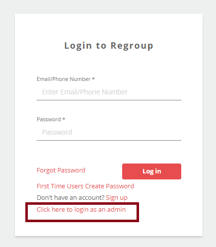 The login to the Regroup page will open. - Click on the Click here to log in if you are an admin option. You will then see the following image: