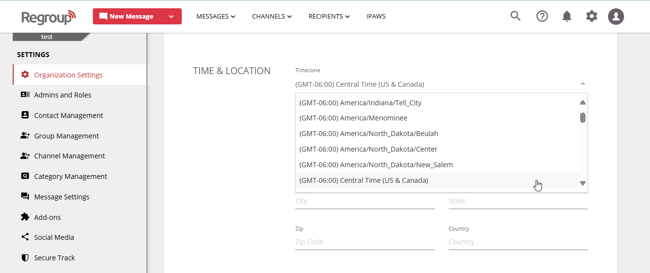 - Select a timezone from the Timezone dropdown. This sets the timestamp for communications.