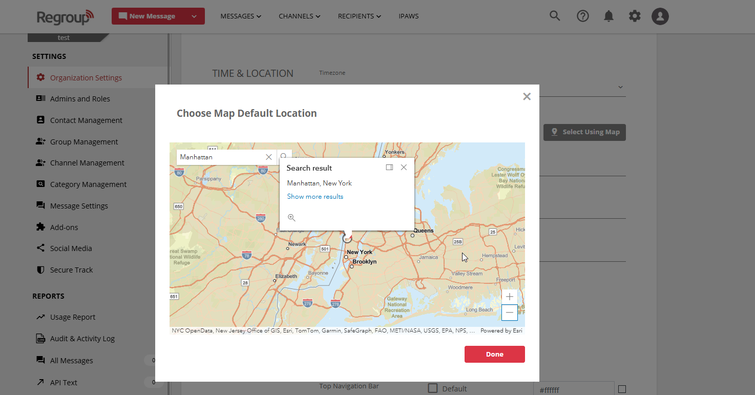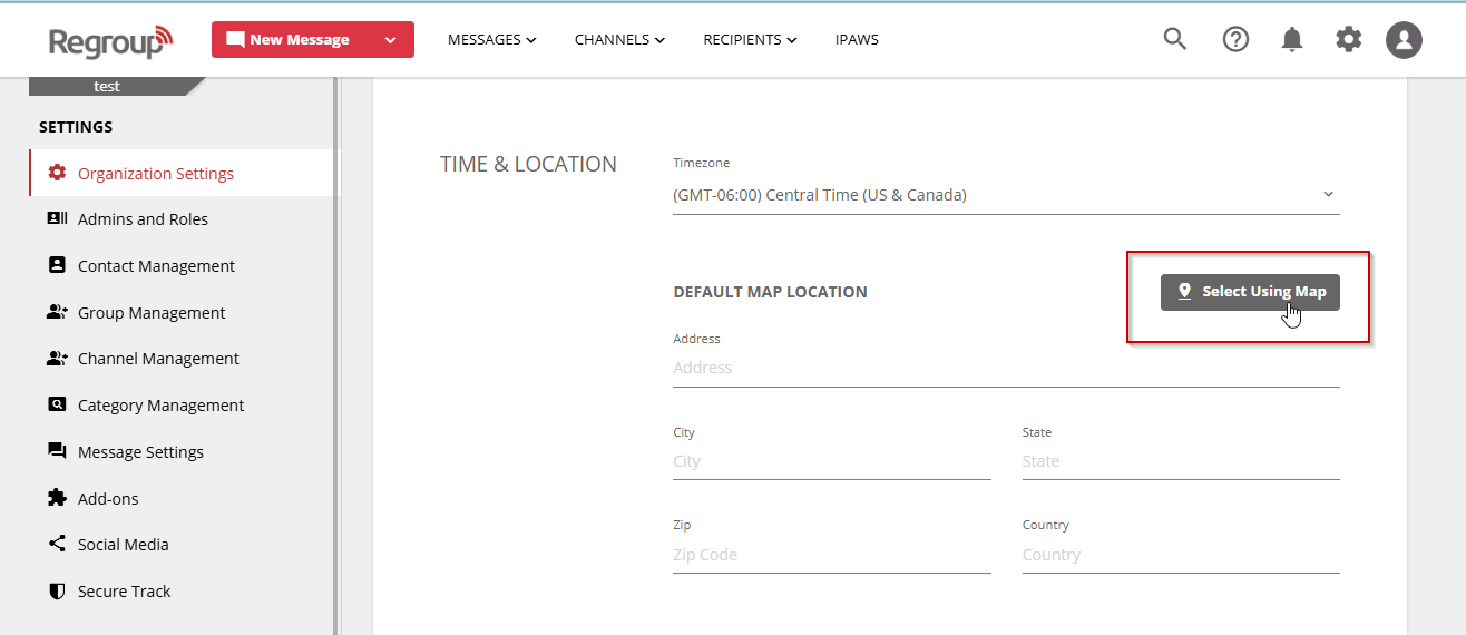 - Click Select Using Map to choose your organization’s location, which sets the map center.