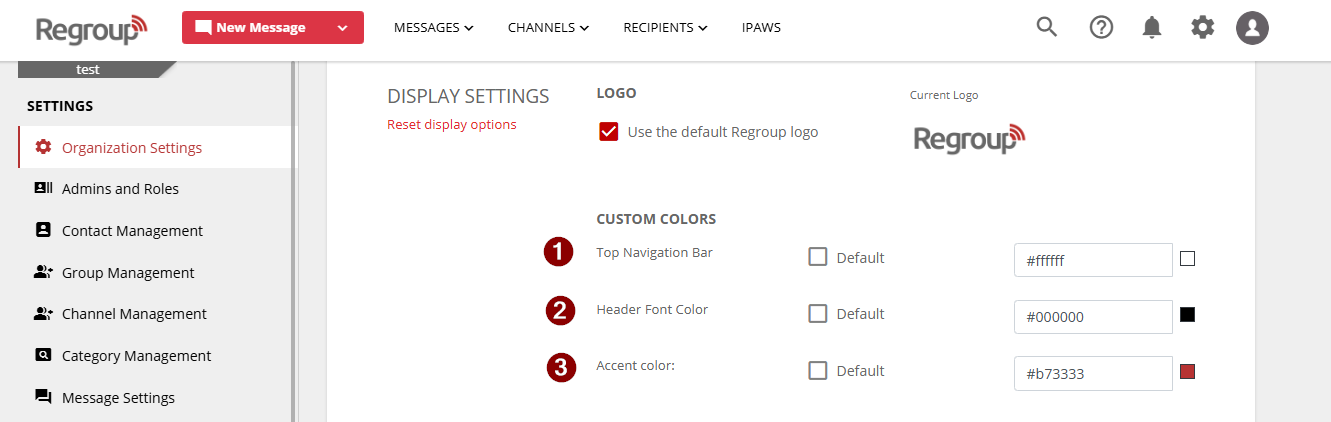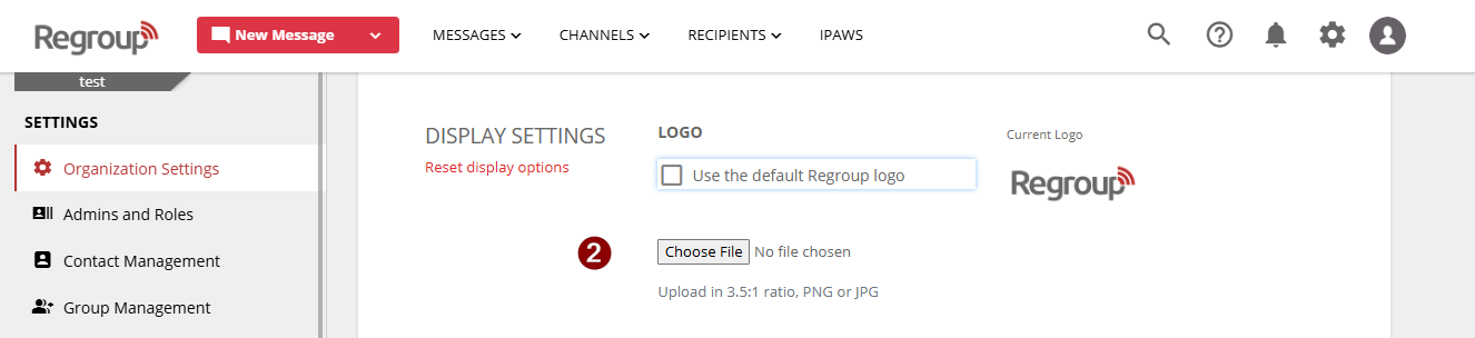 - Uncheck Use the default Regroup logo to upload a custom logo (PNG or JPG, 3.5:1 aspect ratio, 128x36 px).