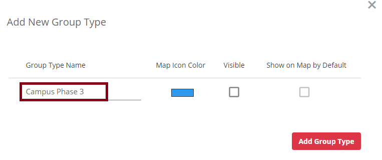 - Check Show on Map by Default to display the group type on the map (available only if Visible is checked).
