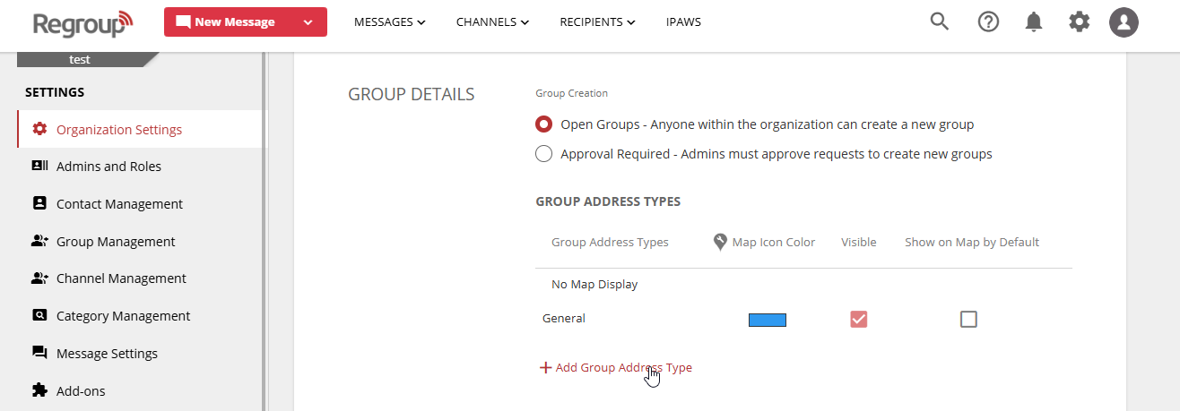 Tip: Group types categorize groups on maps, using the same pin color for easy identification during alerts or recipient selection.